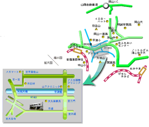 ![]() 平津橋もしくは矢坂大橋交差点を 左折して下さい。 |